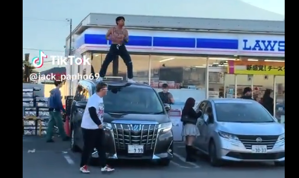 富士山を背景に望む山梨県富士河口湖町のコンビニ駐車場で、タイ人インフルエンサーの男性が車の屋根に立って半裸で踊る動画が交流サイト(SNS)で拡散した。