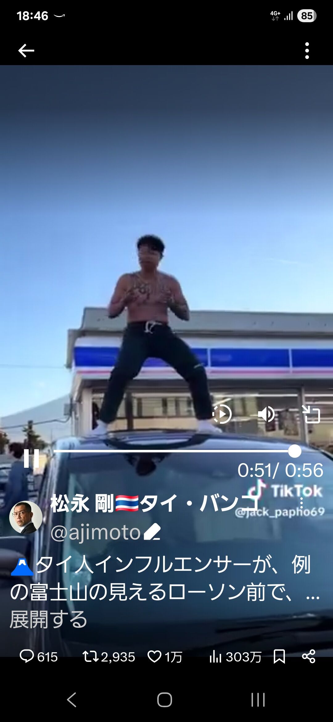 🗻タイ人インフルエンサーが、例の富士山の見えるローソン前で、上半身裸のやらかし動画を公開。そして大炎上。