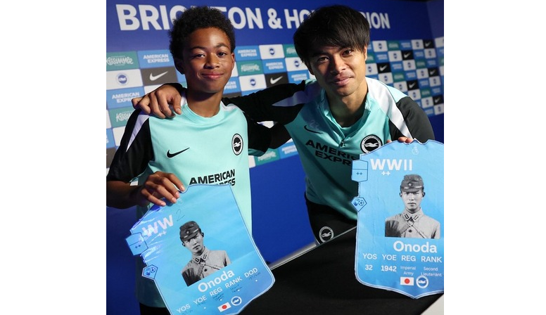 ブライトンのアカデミーは、三笘選手がアカデミーの選手と一緒に、小野田さんの写真を「サッカーカード」のように加工したものを手にした写真を投稿。