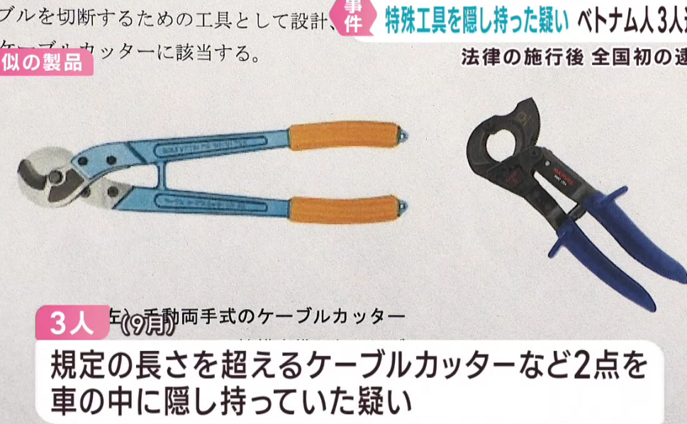 銅線窃盗に使用できるケーブルカッターを隠し持っていたとして、宮城県警は4日、金属盗対策法違反の疑いで、ベトナム国籍の男3人を逮捕 (略)引