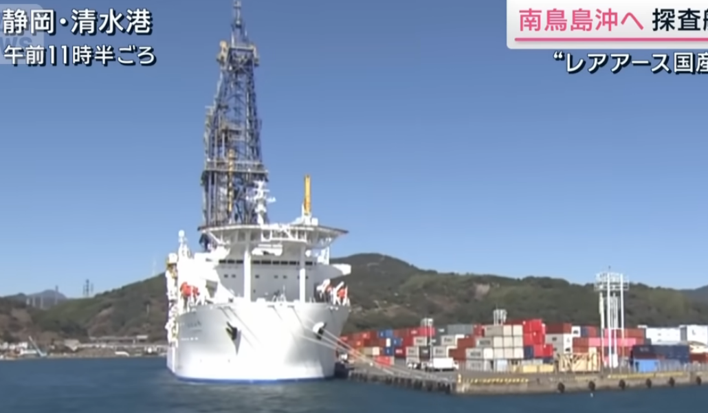 「静岡県の清水港です。こちらの大きな船をご覧ください。巨大なタワーが立っていますが、船の底からの高さはおよそ130m。40階建てのタワマンに相当する高さです。あさって、国産レアアースを開発するため、南鳥島沖に出発します」。 (略)