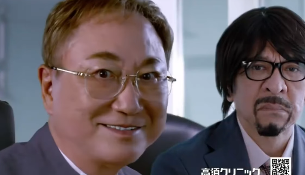 CMでは高須院長がヘリコプターを操縦し、移動する恒例のシーンから始まり、会議している様子が流れた。その中で、高須院長がアップにされると、隣に黒髪のカツラをかぶりメガネをかけ、ひげをたくわえた松本の姿が一瞬だけ映し出されていた。 (略)